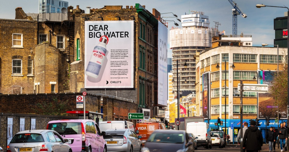 Throughout the day, Chilly’s commissioned three ad-vans to visit the Evian, Highland Spring and Fiji Water offices, each vehicle adorned with an open letter asking the brand to move away from single-use bottles. Chilly’s also put up posters around London, to spread public awareness of the campaign.