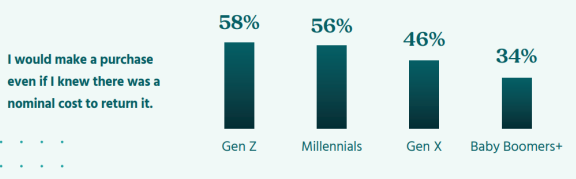 Overall, nearly half of consumers said they are willing to make purchases even if there was a nominal returns charge. However, Gen Z was more than 1.7 times more likely to accept a fee than Baby Boomers. Of the countries surveyed, India, UAE, and South Korea were most willing to accept return charges.