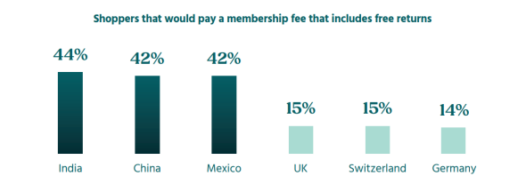27% of respondents said they are inclined to pay for a membership if it means they can return their purchases for free, another 27% would pay return shipping charges. More than four in 10 shoppers in India, China and Mexico would pay a membership fee that includes free returns yet only 15% of UK, German, and Swiss shoppers would pay a membership fee. They would, however, pay for return shipping.